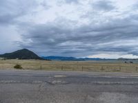 a long street passes a prairie area and mountains in the distance with heavy clouds in the sky