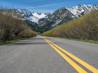 the road is paved with yellow markings and has a snowy mountain range in the background