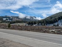 A snow-covered road winds through the scenic landscape of rural Colorado. Majestic mountains and lush forests surround the road, creating a picturesque winter scene. The clear blue sky and fluffy clouds add to the beauty of nature.