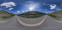 a curved road stretching into the distance and a blue sky with white clouds above it