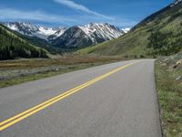 the road is paved with yellow markings and has a snowy mountain range in the background