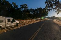 This image captures the tranquil beauty of a rural landscape at dawn. A paved road stretches through the scene, flanked by tall grass fields. The clear sky above casts a warm glow, creating tints and shades on the landscape. The road surface, made of asphalt, catches the first light of the break of day, creating hard shadows. This agricultural area is peaceful and serene, with no cars in sight. It represents the simplicity and tranquility of rural life. A perfect image for any project related to nature, landscapes, or rural settings.