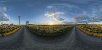 A rural dirt road at dawn, lined with fields and greenery under a clear sky. Sun visible, casting hard shadows; windmill in the distance. A peaceful agricultural scene at the break of day.