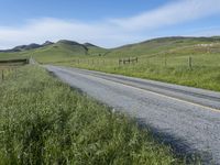 This is an image of a road in California, USA. The landscape features a lush green grass surface surrounded by hills and pastures. The rural scenery captures the natural beauty of the elevated highland. In the foreground, there is a field of colorful flowers, adding to the vibrant atmosphere. The grey sky creates a gloomy mood, contrasting with the vibrant vegetation. This photo showcases the natural environment and agricultural infrastructure in California.