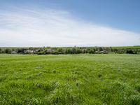 a green pasture field is surrounded by a village and blue sky with clouds overhead in a rural setting
