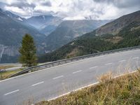 An elevated road in Austria winds through the mountainous landscape. The road surface is asphalt and flanked by trees and vegetation. Guard rails and Armco barriers provide safety on the high slopes. A beautiful rural scene in Europe.