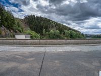A rural European landscape with a classic architecture dam. Grey skies set a gloomy tone over the forested mountains of Germany. Concrete streets wind through nature, showcasing urban and rural profiles.