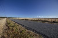 A picturesque rural landscape with an asphalt road cutting through fertile farmland. Clear sky and fluffy clouds add to the serene beauty. Rolling fields of vegetation stretch as far as the eye can see.