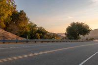 A rural landscape at dawn. The road surface, lined with Armco barriers and guard rails, stretches towards the horizon. The asphalt reflects the colorful sky as clouds float above the hills.