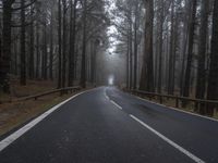 This is an image of a road in Tenerife, Spain. The asphalt road surface is wet from the low fog and mist that hangs over the landscape. The road cuts through a dense forest of trees, creating a picturesque view of the rural nature. The dawn light adds an emotional touch to the gloomy and grey sky in the background. This photo captures the natural environment of Tenerife, showcasing the beauty of the European landscape. The infrastructure of the road signifies the connection to the rest of the island.