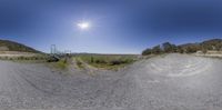 a 360 - angle picture of a dirt road near mountains and green grass with a bright sun in the distance