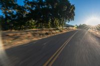 This is a photo of a rural landscape with an asphalt road cutting through it. The road surface is smooth and the surrounding vegetation consists of trees and woody plants. The horizon is clearly visible under the clear sky, with the sun shining brightly. This image represents a sunny day in the countryside, with agriculture and farms in the background. The photo captures the peacefulness and tranquility of the rural area, with the road symbolizing the connection between different parts of the landscape.