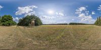 this is an image of the field and some trees in it, as a fisheye view
