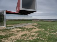 This is an image of a rural landscape in Germany, specifically in the outskirts of Berlin. The open space is adorned with sculptures that blend with the natural surroundings. The cloud-filled sky reflects off the smooth surface of the nearby container. The field is filled with lush green grass, creating a serene and peaceful scene. This photo captures the beauty of the European countryside, showcasing the harmonious relationship between agriculture, art, and nature.