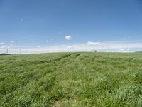 A picturesque rural landscape in Germany with lush green fields, windmills, and wind turbines. The clear sky and fluffy cumulus clouds create a stunning horizon. Incidental people add life to the scene.