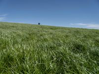 This is an image of a lush green landscape in rural Germany. The vast open space is covered in a blanket of green grass, with trees scattered across the plain. The sky above is clear, with fluffy clouds adding depth to the scene. The rolling slopes and groundcover further enhance the natural beauty of the European countryside. This photo captures the essence of rural agriculture and the tranquility of nature. The incidental people in the image add a sense of scale and human presence. It is a perfect representation of a beautiful day in the German countryside.