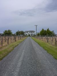 a large white house on a cloudy day in a vineyard country side area near a road lined by fenced vines and plants