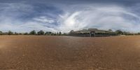 A rural landscape with an open space and a hilltop building. The fisheye perspective captures the vastness of the plain, surrounded by vegetation and a cloudy horizon. A peaceful day in the countryside.