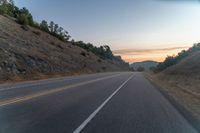 This image captures the beauty of the countryside at dawn. The road, surrounded by hills and vegetation, meanders through the landscape. On the right side of the road, there is a small tree line, adding to the picturesque scene. The clouds in the sky create a stunning backdrop. The road surface, made of asphalt, shines in the soft light of the rising sun. This photo represents the rural charm and tranquility of early morning in the countryside.