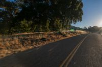 This image captures an asphalt road in a rural landscape at dusk. The sun is setting over the road, casting a warm glow over the scene. Trees can be seen lining the road, adding to the picturesque countryside. The clear sky above is filled with the vibrant colors of the sun setting. This photo represents the beauty of a peaceful evening in the countryside, where nature and the rural landscape merge seamlessly.