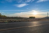 This is an image of a rural landscape at dawn. The asphalt road winds through the hills and plains, with trees lining the thoroughfare. The sunlight breaks through the clouds, casting a warm glow on the land and the lake in the distance. A guard rail and an Armco barrier can be seen along the road, ensuring safety for drivers. Overhead power lines stretch across the sky, providing electricity to the area. This serene scene captures the beauty of nature and the peacefulness of the countryside at the break of day.