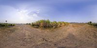 A wide angle view of a dirt road cutting through a field with patches of grass. The rural landscape showcases the natural beauty of Thailand. Clear skies and a rugged terrain create a picturesque scene.