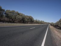 A rural landscape with parallel roads cutting through the vegetation. Clear skies illuminate the tree-lined path. The road's asphalt surface glistens under the daylight. A perfect day for a drive in the countryside.