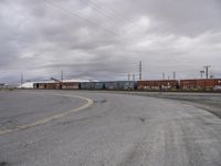 Endless road through the rural landscape of Utah, lined with agricultural land lots. Grey sky contrasts with the asphalt road surface. A freight train travels alongside the road, showcasing the infrastructure of the area.