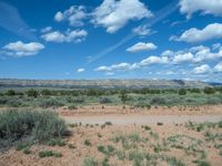 A profile view of a rural landscape in Utah. Off-road tracks wind through the nature-filled campground, surrounded by gravel and dirt roads. Clear skies and fluffy clouds complete the picturesque day scene in the USA.