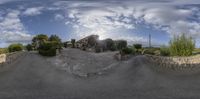 Rural Majorca at dawn, a straight road leading to a farmhouse. The sun visible amidst clouds, casting a sunny glow over the Balearic Islands. Open agricultural spaces under a clear European sky.
