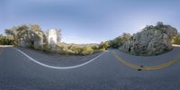 three fisheye lens shots showing a truck going down the road with a large stone building in the background