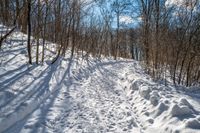 This is an image of a snow-covered road in rural Ontario, Canada. The road stretches straight ahead, bordered by snow banks on either side. The hard shadows cast by the bright sunlight create a dramatic effect on the road. In the distance, the city of Toronto can be seen under a cloudy sky. This photo captures the peacefulness of a snowy day in the Canadian countryside.