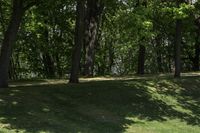 a man tossing a frisbee in a green park next to some trees and a small hill