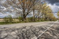 the street in front of some trees is empty and deserted during the day there are trees to the right