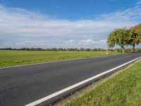 a road in the middle of green grass with trees and blue sky behind it near the roadway