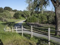 A picturesque rural road in California. Lush green landscape with vibrant vegetation and a split rail fence. Clear sunny sky casts hard shadows. Experience the beauty of California's natural environment.