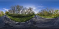 a street view with an image of a very distorted landscape of trees and the sky