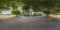 A scenic view of a rural road surrounded by lush green vegetation. The empty road leads to a recreational destination, with a gate visible in the distance. The sunlight filters through the branches of deciduous trees, creating a beautiful landscape.