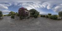Rural road in Majorca, Spain, lined with farmland and farmhouses. The Balearic Islands' open spaces under a sunny sky. A serene daybreak over a straight driveway leading to a quarter home.