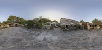 A rural road in Majorca, Spain, lined with agriculture fields and farms. The Balearic Islands scenery under a sunny European sky. Sunrise illuminates the straight road leading to a charming home.