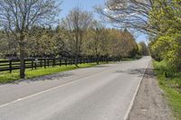 A rural road in Ontario, Canada, lined with lush green trees and a split-rail fence. The clear sky and absence of traffic make it a peaceful day in the countryside.