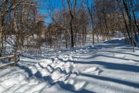 Rural road in Ontario, Canada, lined with tall snow-covered trees. Clear sky provides a picturesque backdrop to the snowy slope leading to a trail with a bench. A serene winter day in Ontario's countryside.