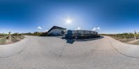 a panorama of a large tractor in the middle of a road, with a building on the back