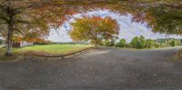 A rural road winds through a park filled with blooming trees and fallen leaves. The gloomy grey sky adds to the moody landscape. A perfect spot for outdoor recreation and enjoying nature's beauty.