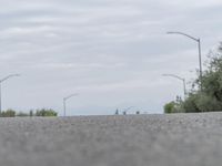 A gloomy day in a rural area with a grey sky. A lonely road winds through an open space with low grass and trees. Street lights line the road, leading to a parking garage. Focus stacking technique used to capture the details of the scene.