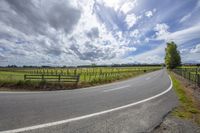 A rural road lined with lush green fields and sunflowers. The open road stretches into the distance, surrounded by a picturesque landscape. Cumulus clouds add depth to the bright blue sky.