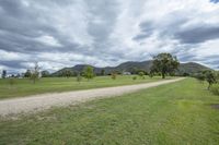A gloomy day in the highlands with a grey sky covering the lush green landscape. The road, covered in gravel and sand, winds through the vegetation-covered mountains. A serene and rural natural scene.