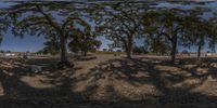 a full view of a bunch of trees in the middle of the road and horses out in a pasture