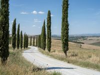 This is an image of a dirt road winding through the rugged landscape of Tuscany, Italy. The scenic view showcases the natural beauty of the countryside, with gravel paths and clear skies overhead. The picturesque garden features a harvest of vibrant flowers and lush greenery. In the distance, iconic cypress trees line the horizon, adding to the charm and authenticity of the European countryside. This photo captures the serenity and tranquility of rural Tuscany, offering a glimpse into its captivating beauty.
