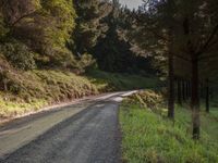 A rural road with curves, surrounded by lush vegetation and tall trees. Sunlight casts hard shadows on the asphalt road surface, creating a picturesque landscape. A perfect day for a drive.